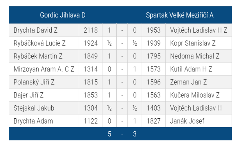 12.11.2023 proběhlo druhé kolo Krajského přeboru Vysočiny v prostorách DDM Jihlava. Proti sobě nastoupili družstva Gordic Jihlava D a Spartak Velké Meziříčí A. Do zápasu vstupoval Gordic Jihlava jako mírný favorit, ovšem konečný výsledek byl pro soupeře až moc krutý.