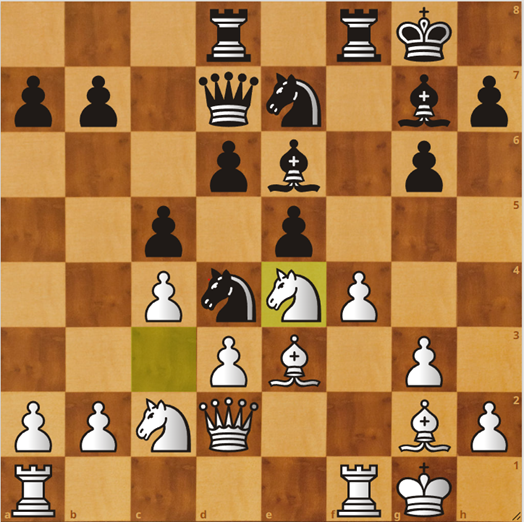 Řešení diagramu: Pokud jste našli 18 … Jxc2, 18. Dxc2 Jf5, 19. Sf2 dxf4 (19. Dd2, nebo Ve1 by vedlo ke ztrátám přes černého silné pole d4). 20. gxf4 b5, doufáme, že jste z našeho klubu.