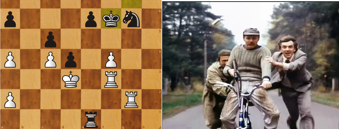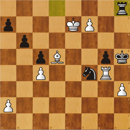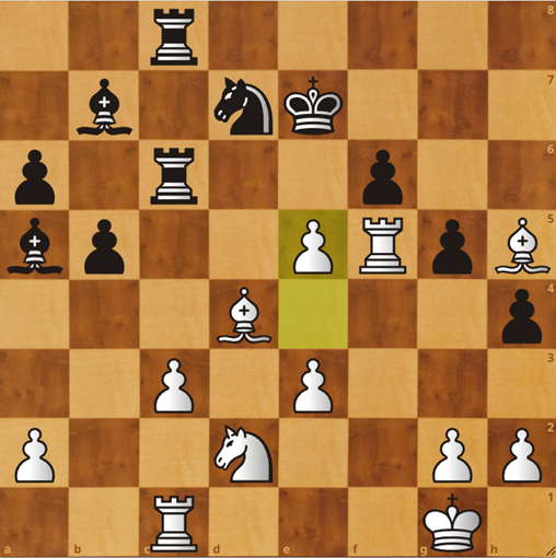 26. e5 a nastupuje slepota, kde po výměnách na e5 dá bílý šach věží na f7 a slupne střelce. Tonda s puškou míří špatně a bod divočák zamíří do obilí. Hotovo vyřízeno 2,5 – 0,5.