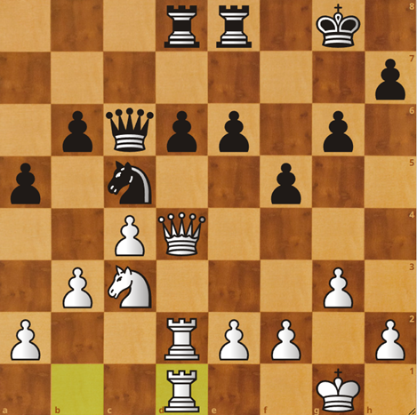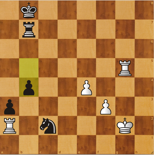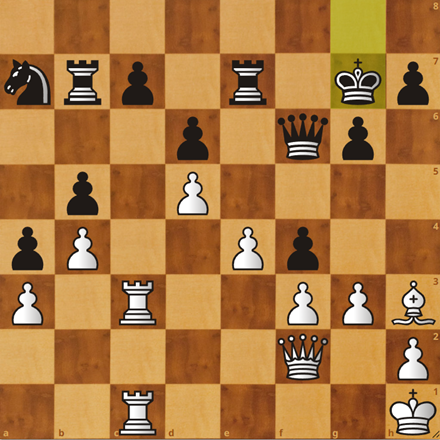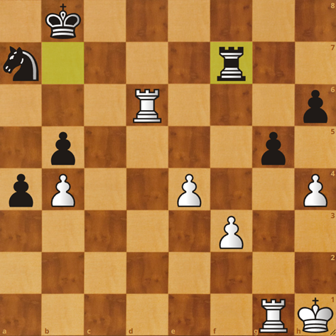 Zdánlivě nejslabší figurka na šachovnici je koník na a7, stojí hezky pevně podpořen věží z b7. Stačí si pokrýt 8. řadu, aby nechtěl střelec napadnout věžku. Na chodbě dochází k debatám nevěřících, kteří nechtějí další 2 hodiny čekat, až to praskne a černý se vzdá.