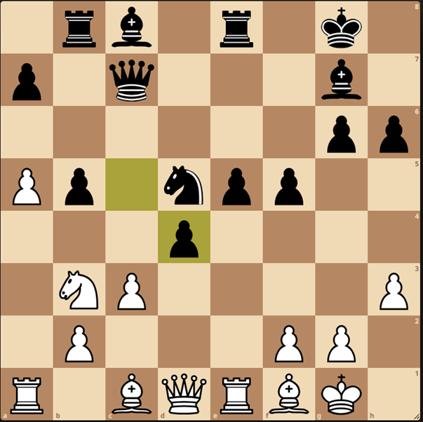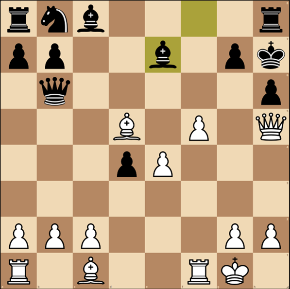 Soupeř byl nejspíš překvapen, a proto zvolil pochybnou obranu spojenou s absencí vývinu, ale zato ztrátou temp. Možná sehrála roli i špetka psychologie, tah Jxf7 vypadá na první pohled, že je schopen ho zahrát jen hráč zcela prostý duchem. Zajímavá pozice vznikla po 13. tahu černého. Zde jsem také strávil nejvíc času. Slibných možností je hodně, kterou si vybrat?