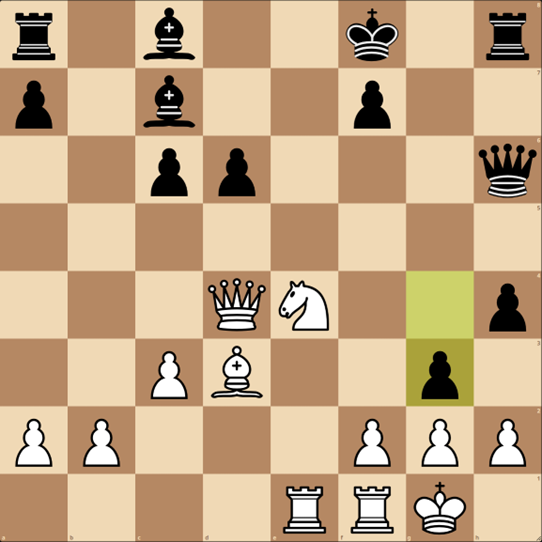 V těsném závěsu jsem kontroval na sedmičce já. Co k partii říct, asi největším problémem bílého bylo, že si přišel dát partičku šachů, kdežto já byl spíš naladěný na vrchcáby řízlé čínským pexesem. Partii jsme rozehráli hodně vedlejší variantou mírně vedlější varianty Skostké. Bílý hrál přirozené vývinové tahy, kdežto já točil kolem štěstí; slabý vývin; slabý král, ale zato zběsilý nástup pěšci na královském křídle. Vyvolávat chiméry, to by mi šlo. Měl jsem štěstí, že soupeř trochu uvěřil mé strategii (a nebo její absenci) a přes armádu přízraků neviděl moc dobře. Přišlo chvilkové zatmění, které ale úplně stačilo. Přikládám diagram z předposledního tahu partie, jak měl bílý pokračovat a přepsat dějiny?