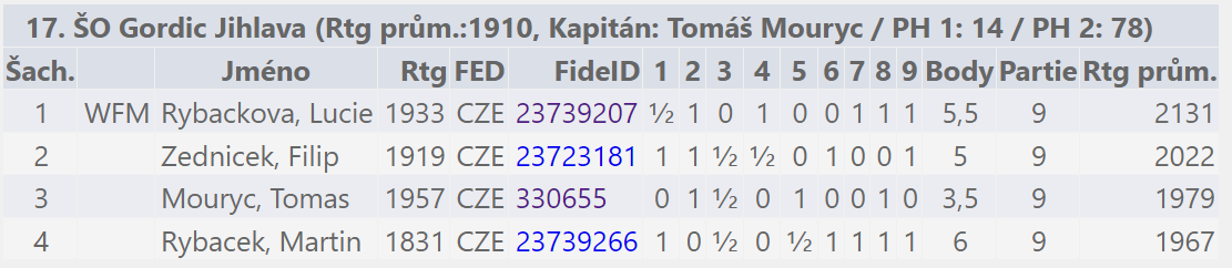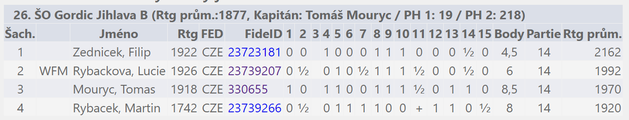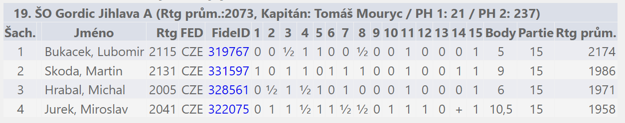 Do nedělního rapidu už nastoupilo pouze druhé družstvo. Zatímco v sobotním blesku byl bodově nejúspěšnějším hráčem kapitán ‚veterán‘, v neděli se situace otočila. Dlouhé partie v turnaji, který se táhl až do večerních hodin (s vyhlídkou na více než dvě hodiny za volantem), si vybraly svou daň v podobě únavy. Naštěstí se mládí dralo vpřed a všichni předvedli velmi solidní výkony. Celkové 17. místo (při nasazení na 32.) jasně ukazuje, že jsme se v turnaji rozhodně neztratili.