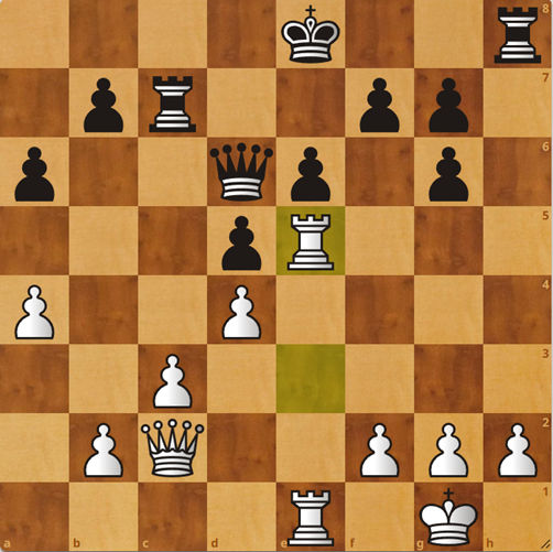 Pes, který štěká, nekouše. Bílý si v tuto chvilku pouští do kalhot. Hrozí h5 a střelec pryč, hrozí Dxf2 a pik na e4 a v budoucnu na e3 vypadá smrtelně. Na hodinách minuta na obě strany. Za koho byste to chtěli hrát? 28. Sd7 Dxf2, 29. Kh1 Se5 a remíza! V tuto chvilku to vypadalo na lepší pozici pro černého. Minimum času. Pavel se tímto nominoval na další zápasy. Gratulujeme!
