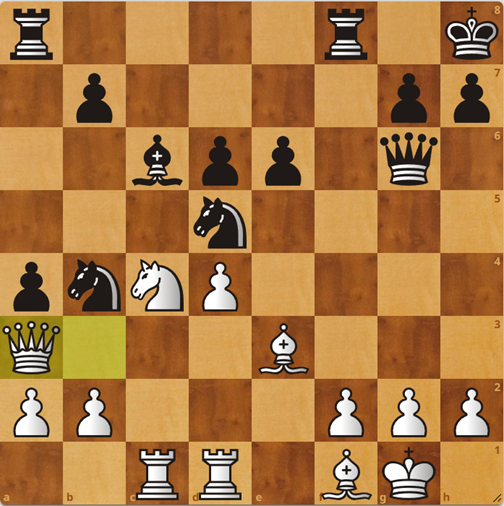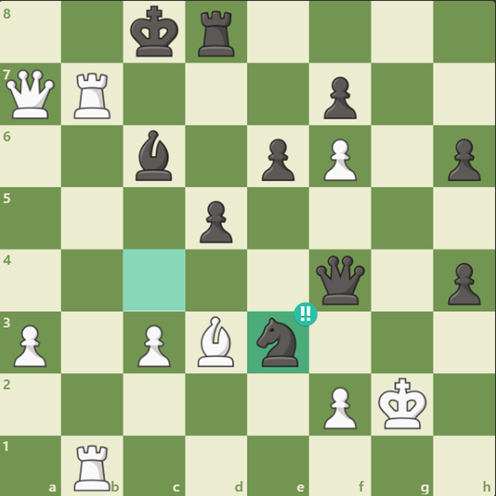 Krocan by si teď měl sednout na křídla a zahrát něco ze 3 možností (Jxa2, Jxe3, Vf3). Je to rovina. Ve splašenosti ale zahraje největší blbost na dvorku a může jít zobat zrní (bránit se v koncovce). Jc2 vypadá lákavě, jen když bílý vezme Dxd6. Černý uplete bič sám na sebe a musí vymýšlet krkolomné obrany v koncovce. Když si myslí, jak to skvěle vymyslel, tak ho podlévají na pekáči. Mat, nebo ztráta figury. 4-2
