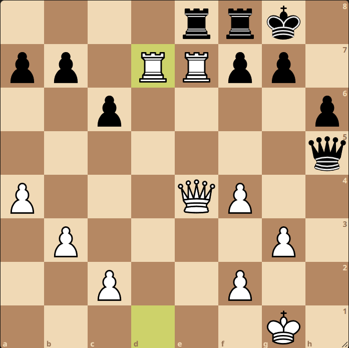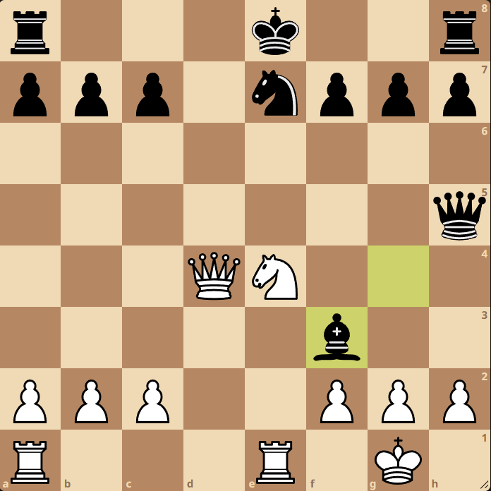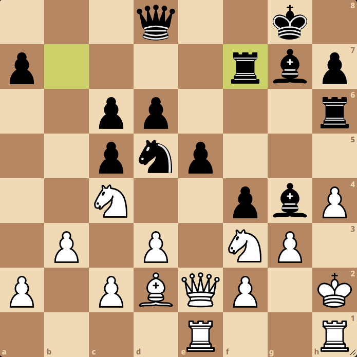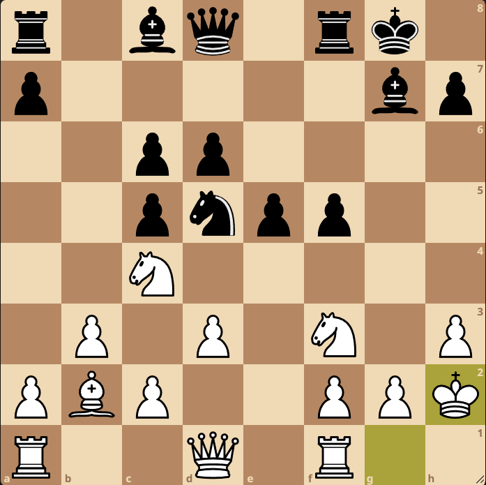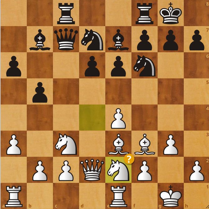 Milý čtenáři, co s tím? gxf3, Jg3, nebo Dxg7. Jak to už k dnešnímu špílu patří, tak jsme to pokazili.