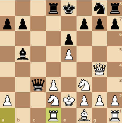 Další sicilka, databáze lichessu zahájení nějak pojmenovala, ale nejdnalo se podle mě o nic standardního. Nevím jestli to byl záměr, ale Kristýna spojením tahů 6. Df3 a 7. Df3 nabaitila černého k zisku dvojice střelců, což však v dané pozici možná objektivně není nejlepším řešením pro černého. Největší šanci měla bílá ve 14. tahu, kde to však nějak spočítat to OTB nebylo vůbec jednoduché, a nakonec zvolila klidnější pokračování. Martin čekal trpělivě na svoji příležitost, která se mu naskytla ve 21. tahu, a… šanci využil.